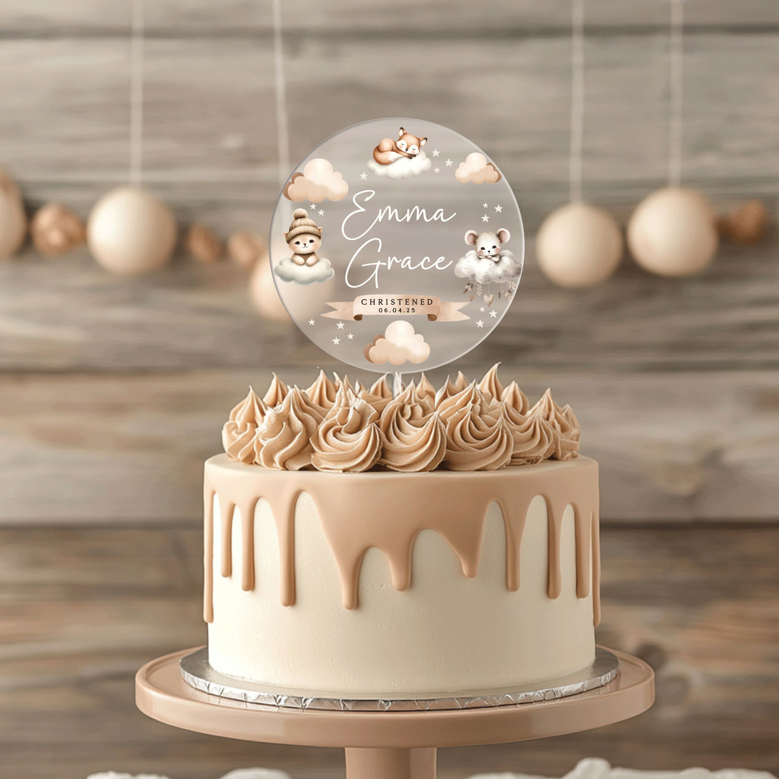 Boho Baptism Cake Topper, Personalized Baptism Acrylic Cake Topper, Neutral Boho Animals Christening Cake Topper