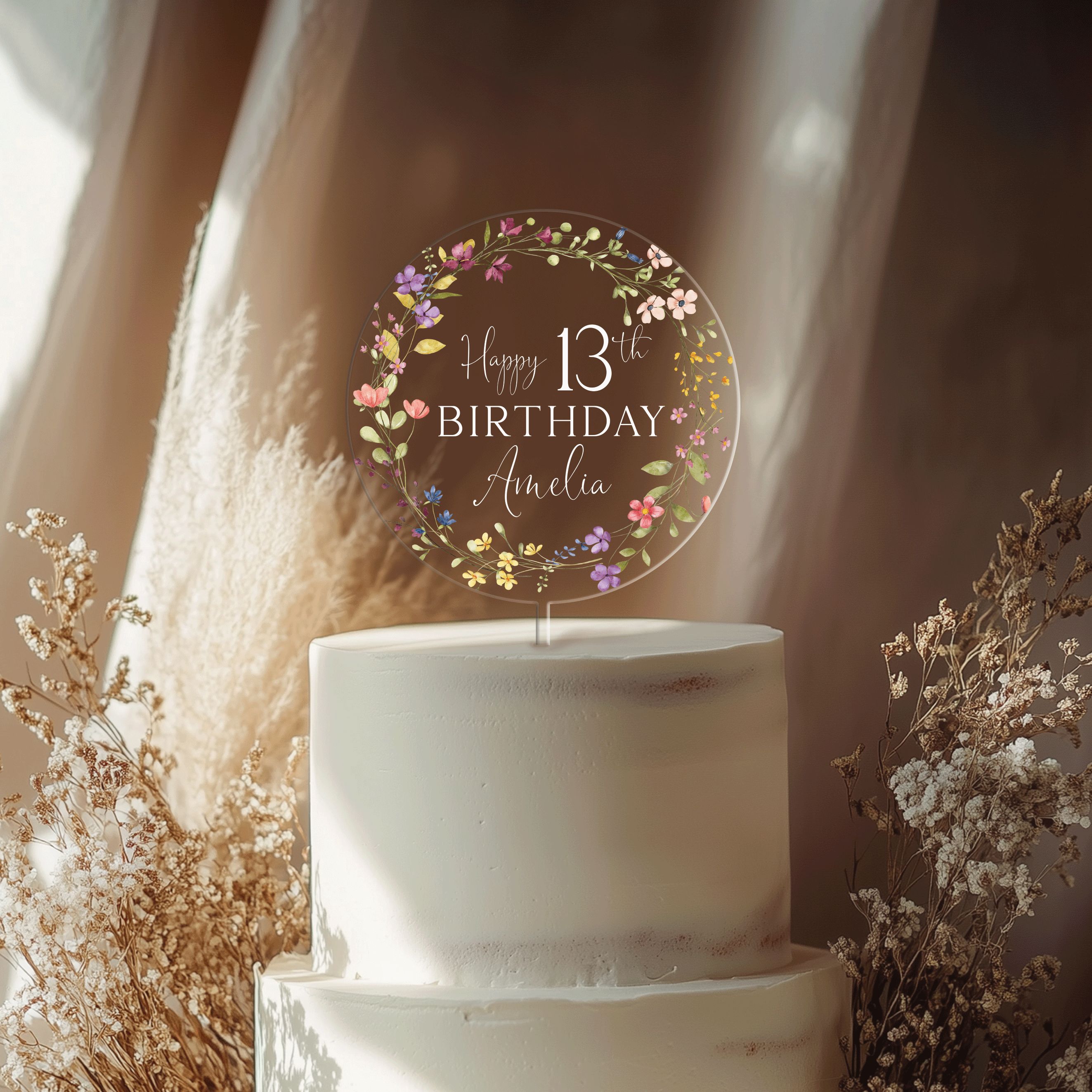 13th Birthday Acrylic Cake Topper, Any Age Wildflowers Birthday Cake Topper