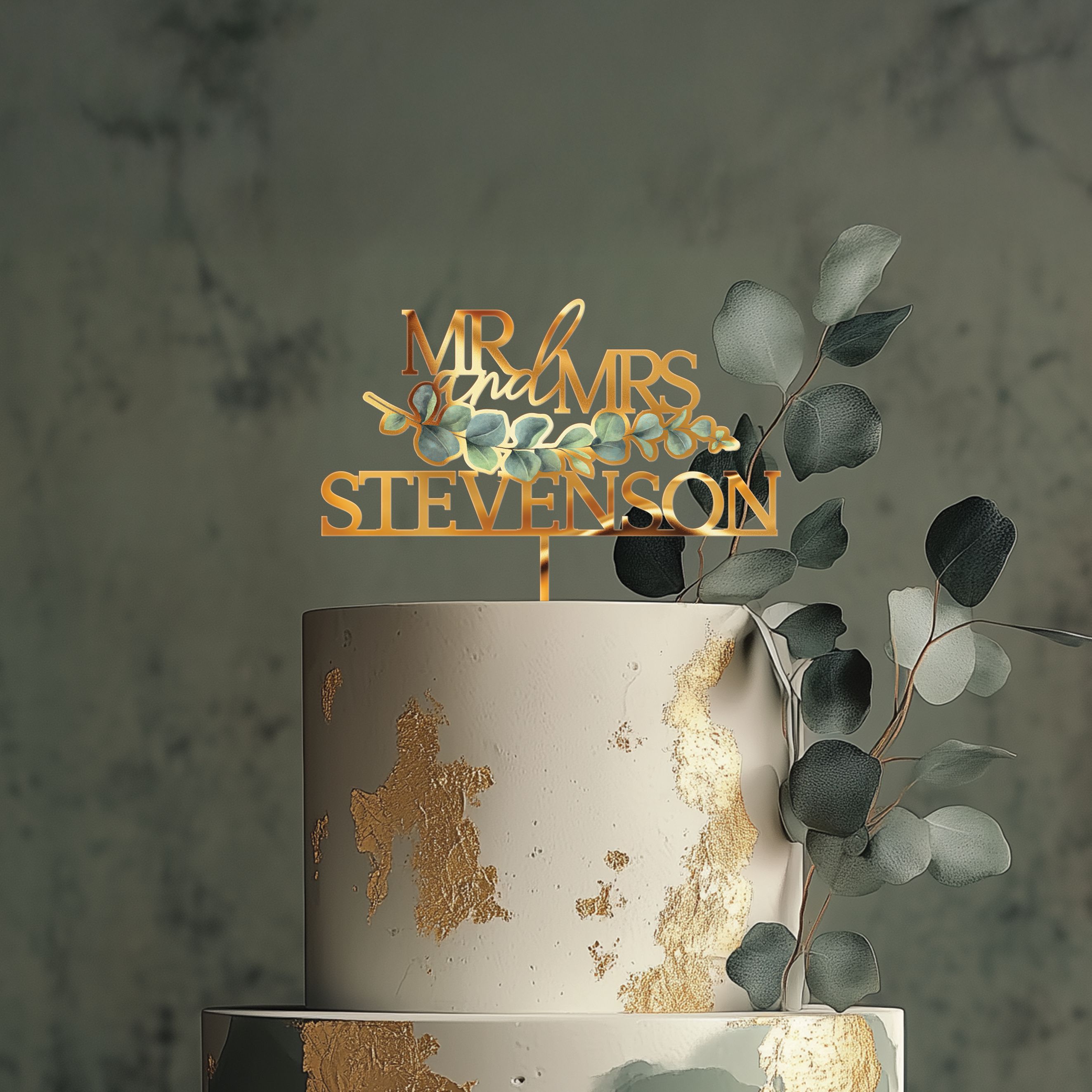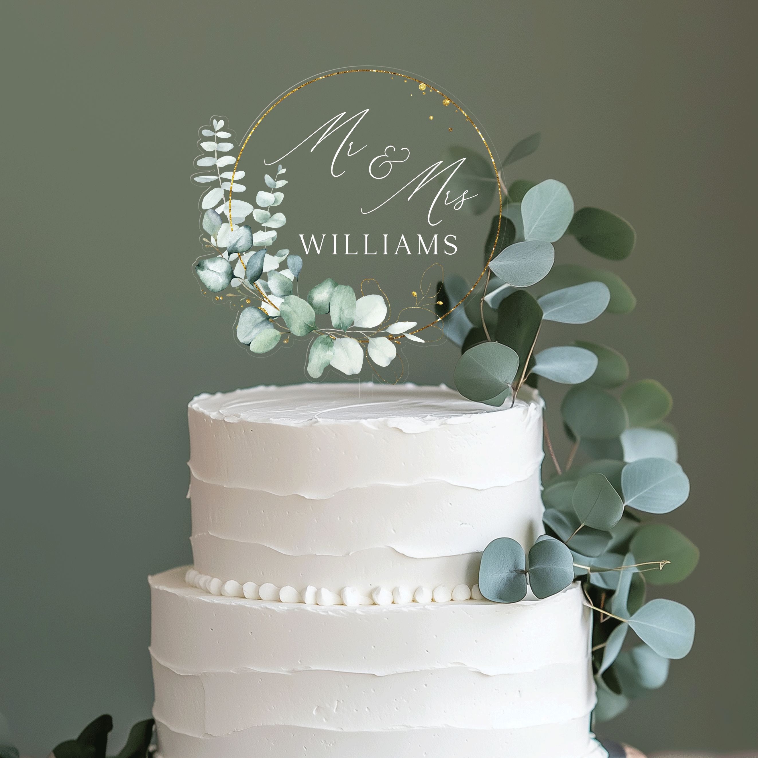 Eucalyptus Wedding Cake Topper, Mr and Mrs Acrylic Cake Topper for Wedding