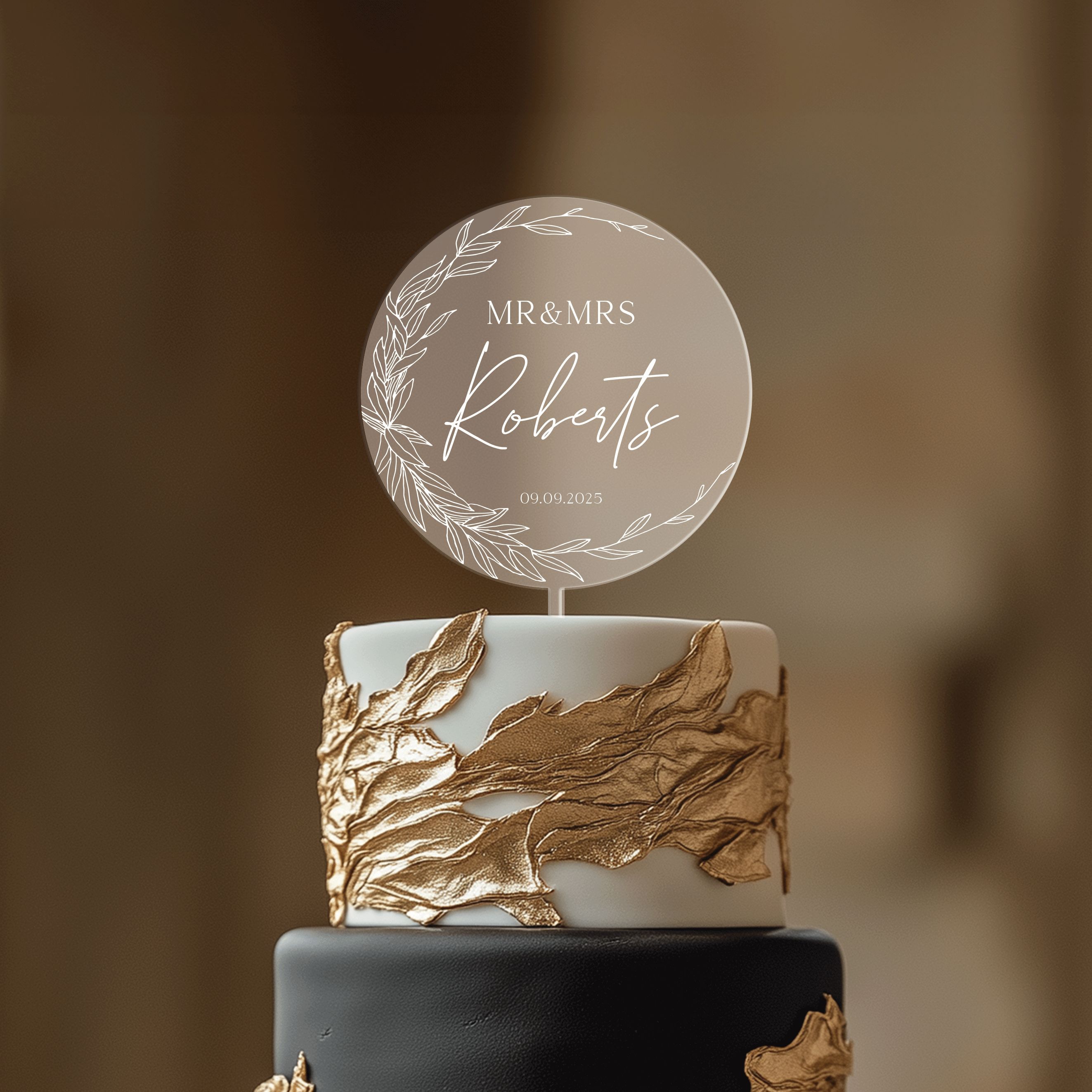 Gold Wreath Wedding Cake Topper, Personalized Acrylic Wedding Cake Topper