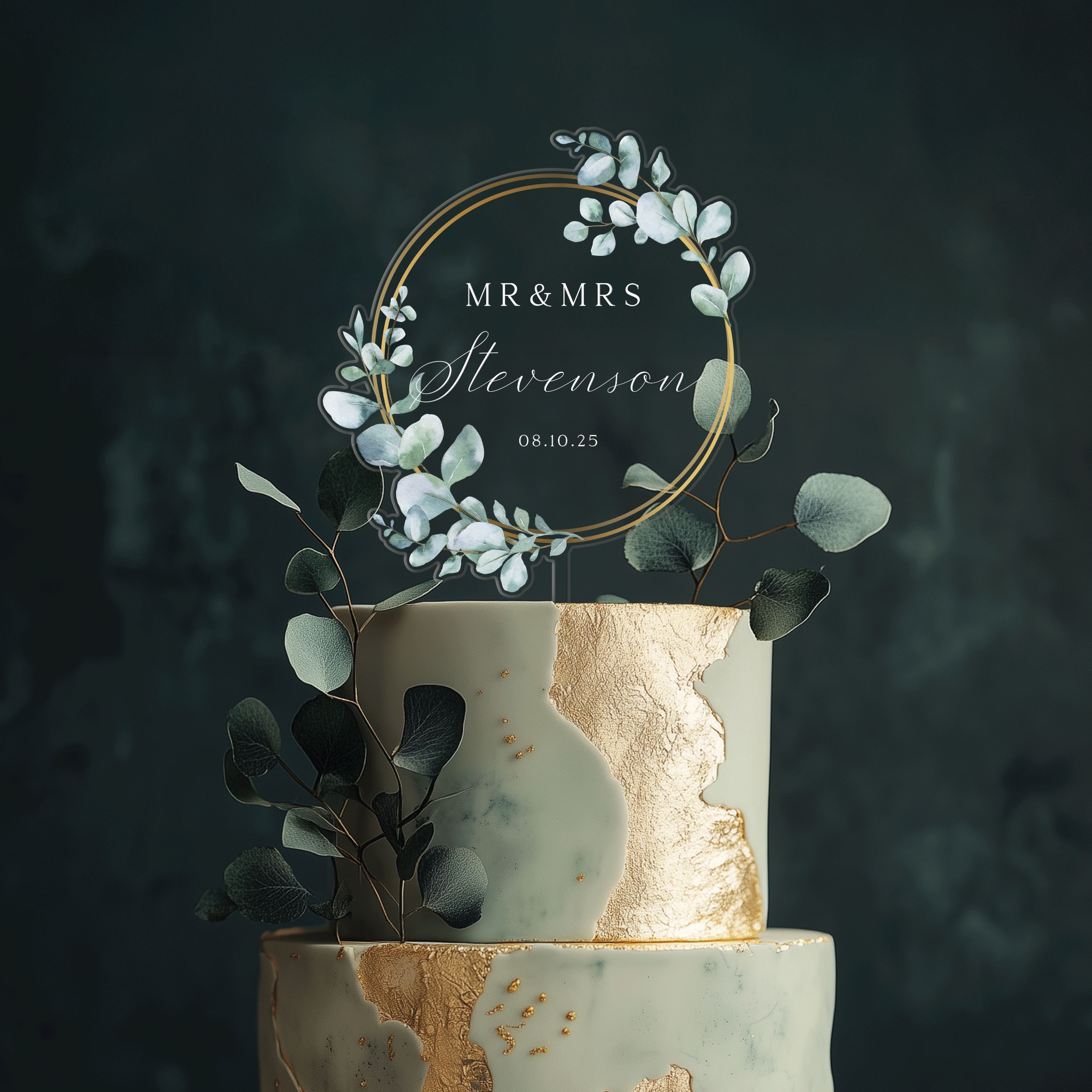 Unique Wedding Cake Topper, Eucalyptus and Gold Cake Topper for Wedding, Mr and Mrs Cake Topper
